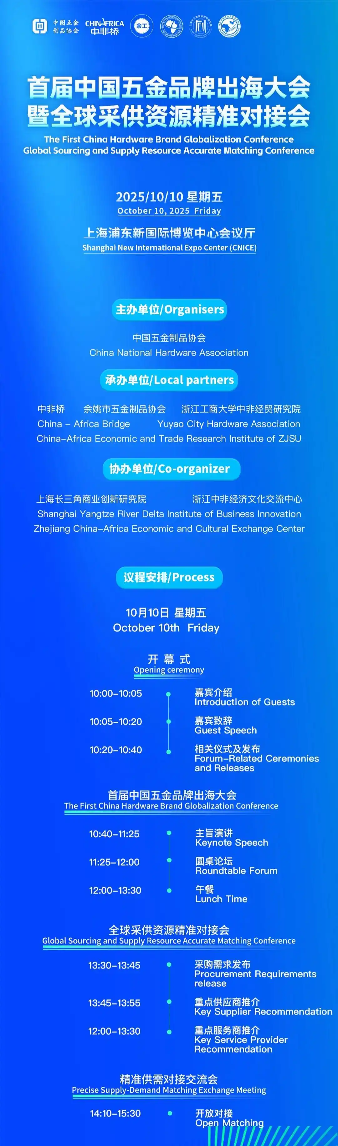首届中国五金品牌出海大会暨全球采供资源精准对接会将于10月10日在上海举行。大会由中国五金制品协会主办,中非桥、浙江工商大学中非经贸研究院、余姚市五金制品协会等共同承办。此次大会以“助推中国五金出海 搭建中外采供桥梁”为主题,汇聚全球五金行业精英,共同探讨中国五金品牌出海新路径,搭建中外采供合作新桥梁。